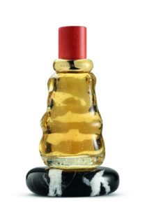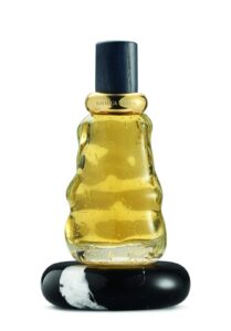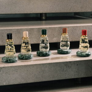また、水のように波打つフォルムのガラスボトルにも注目。ヴェネツィアの景観や吹きガラスの伝統に着想を得たデザインで、ボトル内部には気泡が含まれている。メッツァノッテでは、香りごとに色の異なる木製キャップを組み合わせ、台座にはブラックのマルキーナ大理石を採用している。