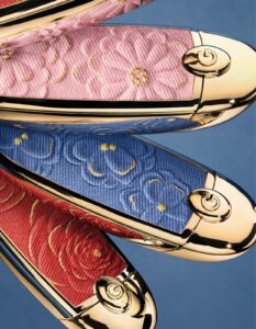 メゾンのアイコニックなリップスティック「ルージュ ジェ」は、限定の専用リップケースを用意。桜を思わせるピンクデニム、爽やかなブルーデニム、鮮烈なバラの花びらが浮かぶレッドデニムの3種を展開する。それぞれ、異なる花のモチーフをエンボス加工&刺繍であしらっているのがポイント。ゴールドの箔押しプリントも施し、エレガントなビジュアルに仕上げている。
